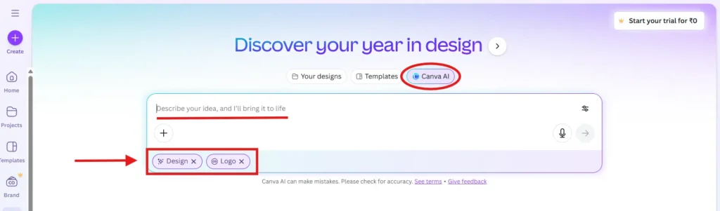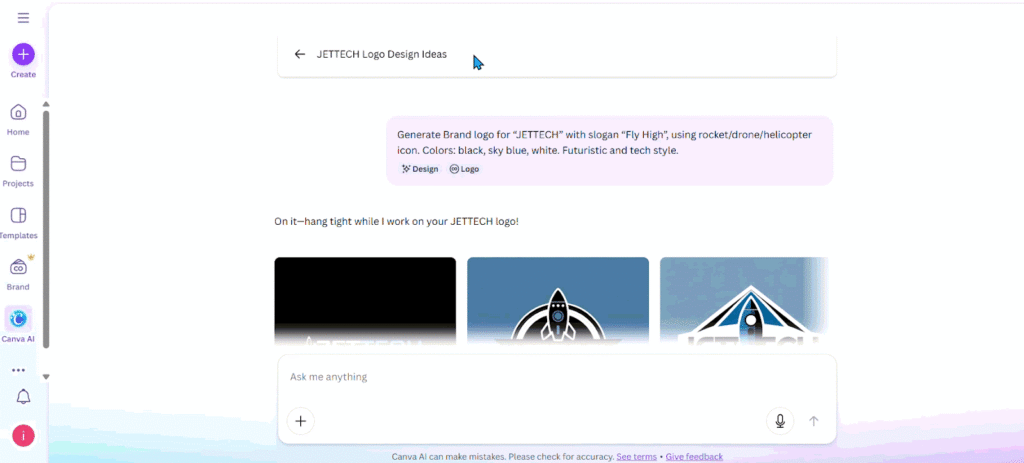When you click the ‘Create a Logo with AI’ button, the page shown below will open. There, select ‘Logo’ under the Design options and enter a simple prompt. That’s all, Canva AI will start generating logo designs automatically.