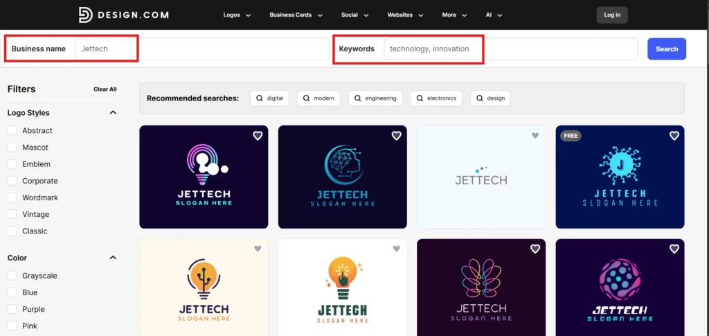First, you only need to enter your business name. After that, a small pop-up will appear asking for keywords related to your business. Once you enter those keywords and click continue, the platform will generate your logo within a few seconds. You will then see many different logo templates with your business name already applied. If you want to change your business name or keywords, you can easily do that using the options given at the top. I’ve added an image below so you can check and understand it better.